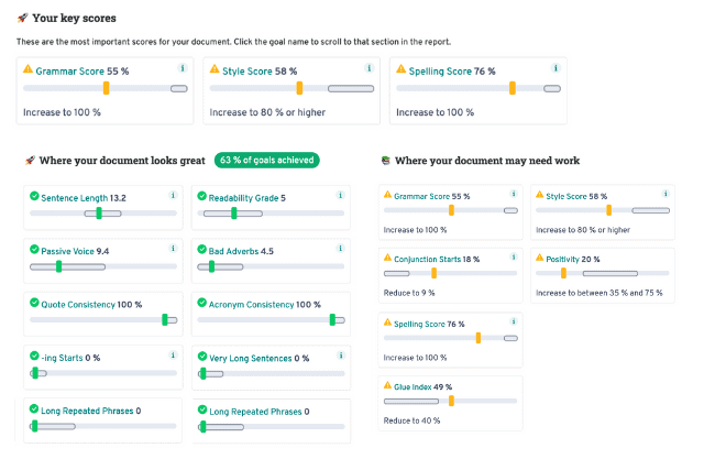 ProWritingAid allows you to dig into the details and get a solid high-level view of your manuscript. The Summary Report gives you goals to work on, allowing you to break the self-editing process up into bite-size pieces that will make it more manageable.