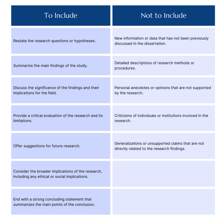 The conclusion of a thesis or dissertation should provide a summary of the key findings of the research and their implications, as well as offer suggestions for future research. Here are some specific elements to include: